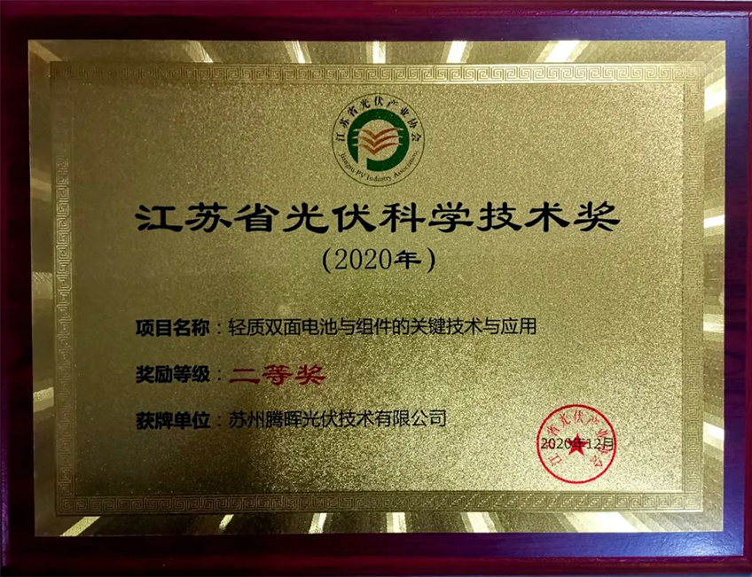 2020年12月4日至5日,由江蘇省光伏產(chǎn)業(yè)協(xié)會(huì)主辦的江蘇省光伏產(chǎn)業(yè)協(xié)同發(fā)展大會(huì)在南京召開。會(huì)議以“協(xié)同、創(chuàng)新、強(qiáng)鏈、提質(zhì)”為主題,匯聚光伏產(chǎn)業(yè)專家,搭建合作交流平臺(tái),共同探討行業(yè)發(fā)展方向,繪制江蘇省光伏產(chǎn)業(yè)健康發(fā)展藍(lán)圖。大會(huì)現(xiàn)場(chǎng)頒發(fā)了2020年度江蘇省光伏產(chǎn)業(yè)協(xié)會(huì)光伏科學(xué)技術(shù)獎(jiǎng)。騰暉光伏憑借“輕質(zhì)雙面電池與組件的關(guān)鍵技術(shù)與應(yīng)用”項(xiàng)目榮獲科學(xué)技術(shù)獎(jiǎng)二等獎(jiǎng)。