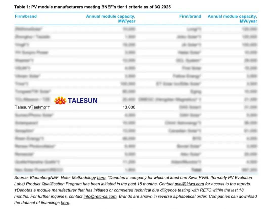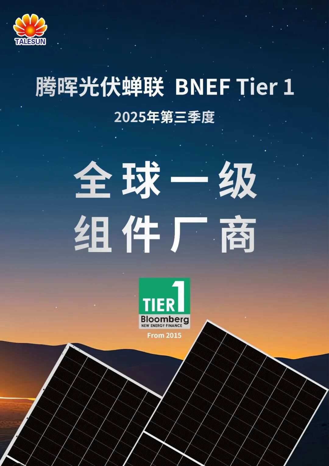 近日,全球知名能源研究機(jī)構(gòu)彭博新能源財(cái)經(jīng)(BloombergNEF)公布了2025年第三季度光伏組件制造商評(píng)級(jí)榜單。騰暉光伏憑借卓越的產(chǎn)品品質(zhì)、穩(wěn)健的財(cái)務(wù)表現(xiàn)和強(qiáng)大的全球市場(chǎng)競(jìng)爭(zhēng)力,蟬聯(lián)2025年第三季度Tier 1組件制造商榜單。